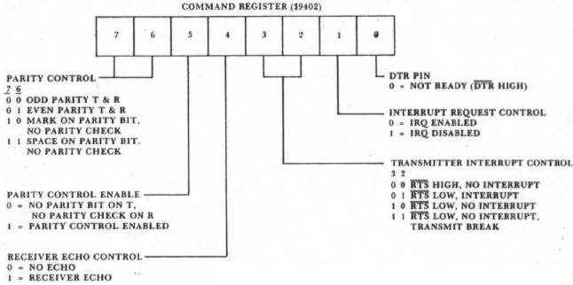 The program to test the 6551 with the AIM 65 and KIM-1 is given in Listing 1. The main program reads the keyboard and outputs this character to the 6551 transmit data register. The interrupt routine (remember to load the interrupt vectors if you use this program) reads the 6551 receive data register when the KIM-1 returns information to the AIM 65. In short, the entire program makes the AIM 65 behave exactly like a teletypewriter terminal as far as the KIM-1 is concerned. Since the 6551 is being operated in the interrupt mode, the first instruction in Listing 1 clears the 6502 interrupt flag to allow the 6551 to interrupt it. The next two instructions in the program load the command register. Refer to Figure 3 to see what bits were set or cleared. Since the KIM-1 software in the monitor simply strips the parity bit from any received word, the command register was initialized to disable and disregard any parity bits. Since the 6551 is being operated in an interrupt mode, bit one of the command register is cleared. However, it is the receiver portion of the 6551 that is being allowed to cause an interrupt, thus bit three of the command register is kept at logic one to prevent interrupts from the transmitter. The other bits of the command register control the handshaking signal pins of the 6551, and therefore they were not of any concern in this application.