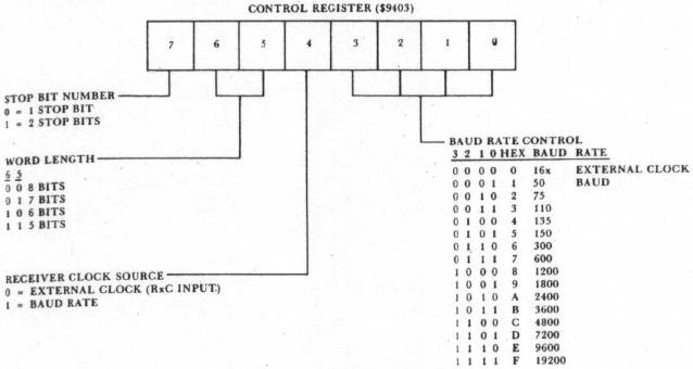 The fourth and fifth instructions in Listing 1 load the control register. Refer to Figure 4. A "three" in the low-order nibble of the control register sets the Baud rate at 110. Higher Baud rates are possible, depending in part on whether the thermal printer on the AIM 65 is used. Without the printer operating, rates as high as 2400 Baud are possible. The usual teletypewriter data format is one start bit, seven data bits, one parity bit, and two stop bits. However, a number of formats will work, and we chose an eight bit word with one stop bit. Note however that the command register was set up for no parity bit, thus our word looks just like a word in the teletypewriter format. If we would have loaded the control register with $BA sending seven bits of word and two ?top bits at 2400 Baud, the program would still work. In order to interface the 6551 to any device you must program the command and control registers to match the protocol of the devices that are communicating.