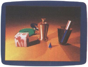 Your lights are in place, the camera is ready, and now it's showtime. Options abound at rendering time, too. There are four different rendering options built in: pattern, solid, gourad, and phong. Pattern is similar to the shading used in the work modes; the shading of each polygon is achieved by dithering gray patterns with the polygons in each object to make varying shades of the polygon's color. Solid rendering uses more colors, but each face of the polygon is rendered in a single color. Gourad employs a smoothing algorithm to remove the faceted look of each object.