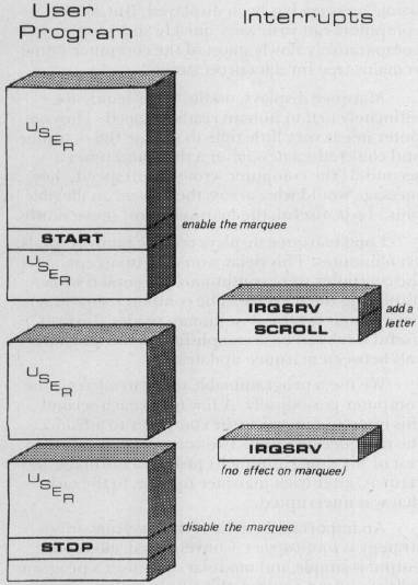 Figure 1.The user doesn't have to control the marquee directly. Instead, periodic interrupts invoke IRQSRV, which decides whether the marquee should be updated. Updates are handled by invoking SCROLL.