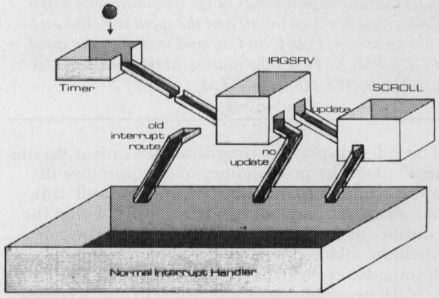 When the marquee is active, interrupt processing is diverted through IRQSRV, which decides whether or not to update the marquee. If no update is necessary, control passes directly to the normal interrupt handler. If the marquee is to be updated, IRQSRV, invokes SCROLL before allowing control to revert to the normal path.