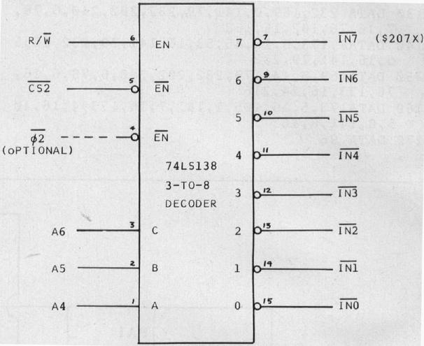 In this case, the ø2 clock signal is not optional since write strobing action is accomplished with this signal in 6502 timing. The application of the low-true version of the ø2 delay in the individual outputs and an acceptable amount of write hold-time loss. (See the early Nuts & Volts columns on read/write timing).