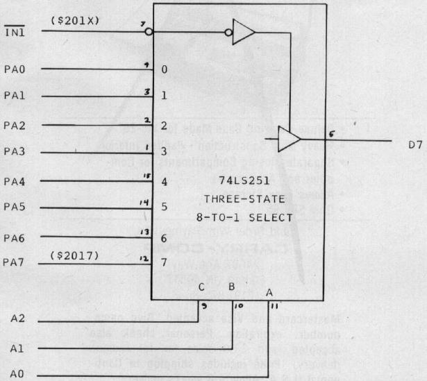Most designers use byte-style input ports for bit input functions. A particular bit in a port can be isolated for making a decision by loading in the port data, ANDing with an appropriate mask, and branching based on the zero flag. However, an 8-bit input port can be realized with a 16-pin 74LS251, a three-state, 8-to-l select function. The single output bit is brought in on data bit D7. Now any of the eight bits may be individually addressed and tested. Such a bit-addressable port is shown in Figure 3. In particular, any bit can be tested with a BIT instruction to the bit address, followed by a branch based on the sign flag. Thus, input bit tests take only two, not three, instructions, and do not change the A register. Since each individual bit in the port has its own unique address, each bit function in software will have its own unique label, making the software somewhat more readable. That is far superior to calling a byte of eight switches SWITCHES.