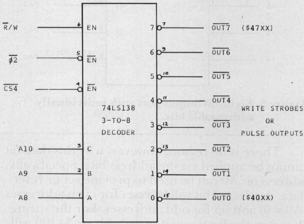 Like simple input, simple output can be bit output and byte output, but also pulse output. As with inputs, the first job is to provide suitable control signals for our output functions. A single 3-to-8 decoder chip can provide eight individual write strobing signals from a coarse address select. (Figure 4.)