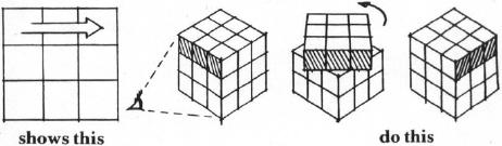 The subroutines necessary for keeping track of all fields are grouped at the end of the program. There is one for each kind of turn. The display of the required turn is connected to the exchange routine. After the display is on the CRT, the exchange is performed by the program. At the same time the plane of the actual cube is turned by the player. Thus the time is used in an optimal way. After the cube is solved, the computer so indicates.
