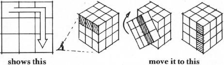 How To Follow The Computer's Instructions: You must keep the same face of the cube towards you at all times. Start with white in the middle of the upper (facing the ceiling) face. As you make the moves, imagine that the cube is held firmly in a vice in the same position throughout. Rotate individual slices, but the whole cube stays in position from start to finish. An "arrow" will appear on screen for each move, and you respond by turning the slice on which the arrow sits in the direction the arrow points. Turn one rotation only per move. (See Figure 1.) If the computer wants you to turn that slice three times, the arrow will reappear in the same place three times. There are only two other possible moves: the front (the side closest to your body) and rear faces (the one furthest away from you). If a strange "curved" arrow appears, that means that you should rotate the entire front face one move in the direction the arrow curves. To perform the same move for the back side, the computer will announce that you should turn the rear side. The arrow will appear curved as it does for a front-side rotation. (See Figure 2.) It sounds a little complicated, but it isn't when you get started. There are really only two different types of moves to make. The computer will wait until you have moved; then you hit a key, and it announces the next move. |