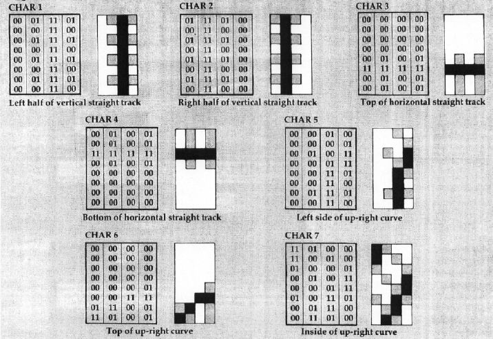 How many total blocks would you need? For one player, you would need two straightaways, four curves, one crossover, two bypasses, four Y-switches, four left-hand switches, and four right-hand switches. For two players, double that and add six new blocks for situations where two different-colored tracks are present on the same block (two crossovers and four bypasses). That gives you a total of 48 blocks, each consisting of 16 characters.