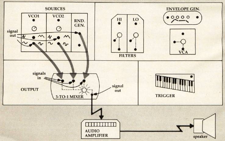 If a patch leads from a Source module, such as an oscillator, to an Output module, such as a mixer, the resulting sound will be audible to the outside world. (See Figure 1.) The term signal is used to describe the electrical current being passed from one module to another. A source signal is one that will eventually be heard as a real sound. A control signal is a varying voltage used to electronically control another module. It does not contain sound information per se.