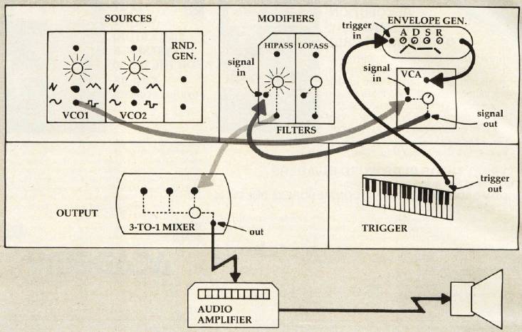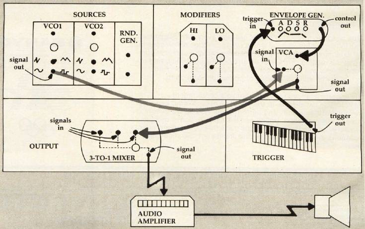The envelope generator puts out an electrical signal which tells the amplifier when to turn up the volume and how long it should take, as well as how high to set the volume, and when and how long to turn it all the way off again. This is why the amplifier module in the diagrams is called "VCA." This stands for Voltage Controlled Amplifier and means that the amplifier can be controlled by an incoming variable voltage, such as the one supplied by the envelope generator.