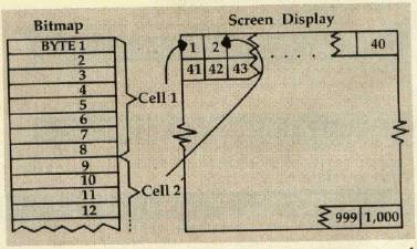 The bitmap memory is constructed similar to screen memory in text mode — it is broken into 1000 areas, each eight bytes in size, which we'll call cells.
