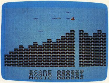 The princess is being held captive in a tower. You must try to save her from the clutches of the evil sorcerer by flying your magic carpet toward the tower, picking her up, and flying back to your base. It won't be easy, though. The sorcerer owns very swift and. powerful birds that he sends out to combat you. These birds are intelligent and will home in on your flying carpet. Worse, the sorcerer has bestowed some of his powers on the birds. They can summon the elements and hurl fiery lightning bolts at you.