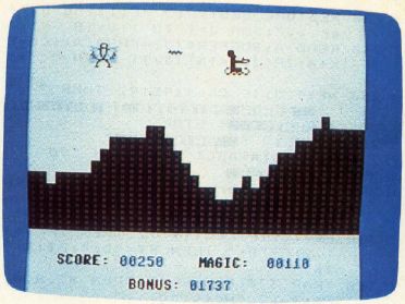 Once the game begins, you fly toward the right of the screen by pushing the joystick while keeping a watchful eye out for the sorcerer's birds. At the bottom of the screen is your score, the amount of magic you have left, and the bonus points you'll receive for rescuing Blondell. The Atari version awards 50 points for each bird you destroy with a lightning bolt, and 10 points for each bird that crashes into the ground while in wild pursuit of your flying carpet. The Commodore versions award only 10 points for birds, no matter how they meet their end. In all versions, the rescue bonus decreases with time, so you might want to be expedient in your quest.