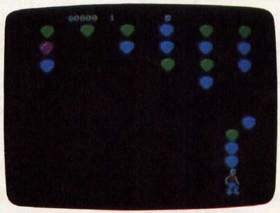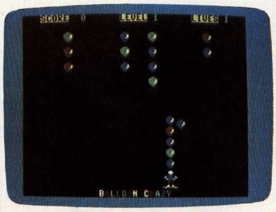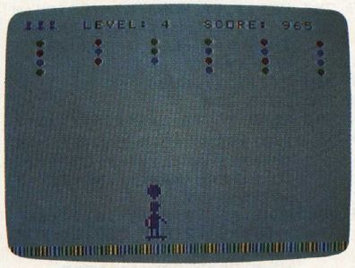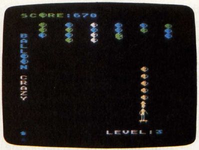 Each game begins by displaying several rows of multicolored balloons at the top of the screen. You are the skateboarder at the bottom. When a balloon begins to fall, move directly under it and catch it on your head. The blue balloons fall slowly, which makes them easy to catch ( but worth the fewest points). The green balloons fall faster, but swiftest of all are the red balloons. As soon as you snare a balloon, it joins the pile on top of your head.