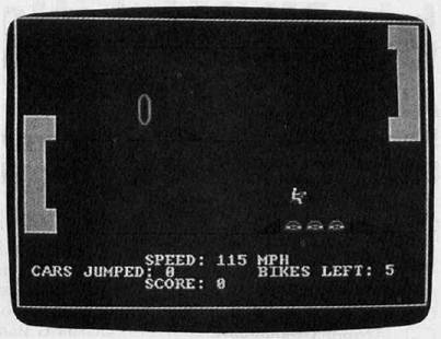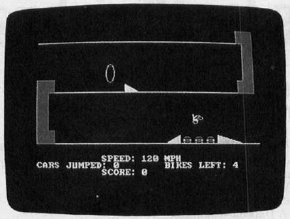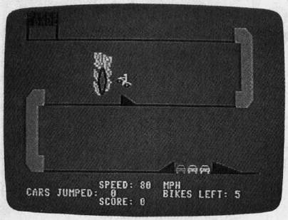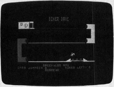 Biker Dave begins by asking you to select one of the two available skill levels: The rookie level is easier than the pro level. With this preliminary out of the way, the program displays the game screen. In the upper left corner of the screen is the garage where you begin the ride. The rest of the screen contains the racetrack, with a couple of tunnels along the way, and a formidable obstacle which consists of several autos flanked by launching and landing ramps. Press the joystick button to accelerate the bike. Your goal is to ride down the track, through the tunnels, and toward the final obstacle, gaining just enough speed to jump over the cars without crashing.