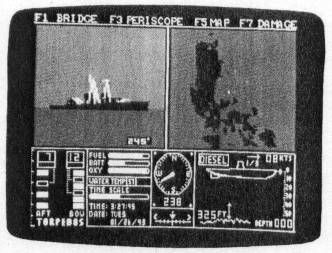 You can command a World War II submarine with ActionSoft's Up Periscope! and your Commodore 64. There are 14 different historical scenarios for surface or submerged patrol. Your targets include freighters, tankers, troop ships, destroyers, and battleships. The fleet-class sub is equipped with Mark 10 and Mark 18 torpedoes, surface and attack radars, a variable-power periscope, complete instrument panel, and ocean charts.