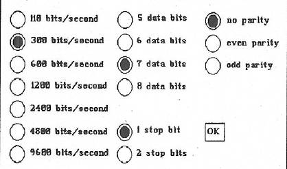 Buttons are useful when you want several choices to be displayed and alterable at once. As an example, if you were writing a telecommunications terminal program, you would probably want all the options to be displayed on the screen simultaneously. (See the accompanying figure for an example.) All at once, the user can see that the speed of communication varies between 110 and 9600; parity may be even, odd, or not selected; and the data and stop bits may be selected in a given number of ways. All of the current settings are clearly shown.