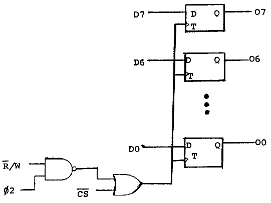An output bit is a flip-flop which can be written to and from the data bus and whose output is connected to the world. Output bits are usually “D” type flip-flops or latches. In TTL there are several configurations, duals, 74LS74, 74LS109; quads, 74LS75, 74LS175; hex, 74LS174; and octal, 74LS273, 74LS373, 74LS374 and others. Again octal types are sometimes a bit hard to come by.