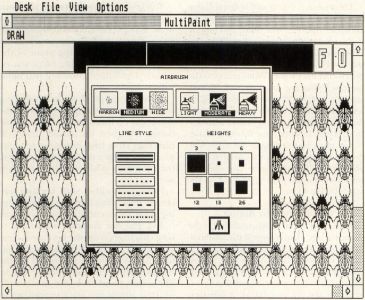 The options dialog contains control settings for weights and line styles, plus the airbrush. Select your icon by left-clicking the mouse. To exit, click on the Atari symbol in the lower right-hand corner.