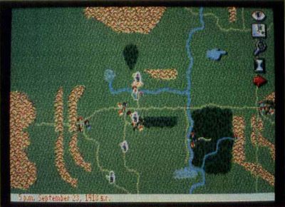 The user interface is easy to manipulate and actually makes playing the game a treat. There are three levels of play, two of which were previously alluded to. The "full map" level is an overview of the entire playing area. Forces at your command and opposing armies are represented by blinking dots. Time does not pass on this level. Icons of an eye, a scroll, a magnifying glass and an hourglass allow all sorts of functions, including saving and reloading a single game. (By the way, there is a game saved to the original disk, facilitating a rudimentary "restart." Once another game is saved, however, this feature is accomplished by the "load game" function.)