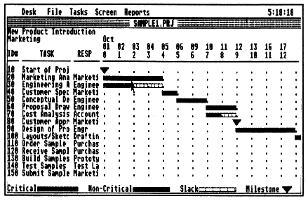 Critical Path's clumsiness shows when the Gantt chart outgrows the screen. At that point, you must either choose a menu item or keyboard equivalent to scroll the screen in the chosen direction by a specified number of time units. No use is made of GEM's scroll bars. Further, you can't use the mouse pointer to select a task (e.g., for modification). Instead, you must activate a menu item, then type in the ID number of the task you want. Further, if you delete a task, you must manually delete it from any other tasks that reference it as a predecessor.