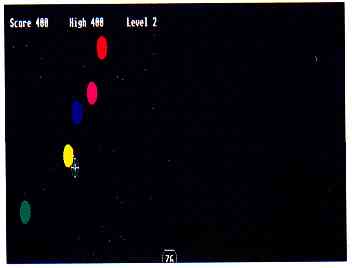 To start the game double-click on GFABASRO.PRG, then pick STYZOR.BAS from the item selector. The title screen appears, then is replaced by the battle screen showing five moving targets and your mouse-controlled blaster. Move the mouse until the crosshairs are centered on a bouncing target then left-click the mouse to fire. You end a wave by destroying all five targets before time, shown in the lower right-hand corner, runs out. Once a wave is finished, it is replaced by another wave, with smaller targets. When you clear all five waves you move to the next level, with faster targets and less time to eliminate them.