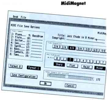 MidiMagnet captures MIDI output from other programs and creates standard MIDI files. It adds format 0 and 1 standard MIDI file output capability to most sequencer programs. Using MidiMagnet, you can upgrade to a newer sequencer program that supports standard MIDI files without forfeiting your existing MIDI song collection.