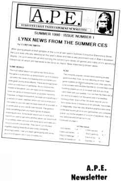 New for Lynx enthusiasts: A.P.E. (Atari Portable Entertainment) is a quarterly newsletter devoted to news, information and game tips for owners of the Lynx portable game system.