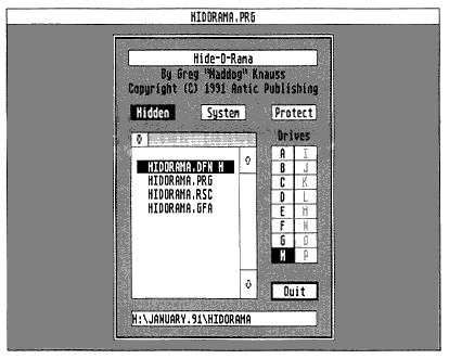 Clearly I had to find a way to prevent a file from appearing in a Desktop window or a file selector, yet still be visible to the program that needed it. I needed Hide-O-Rama. Hide-O-Rama will let you move through each disk drive in your system, into and out of each folder, and mark files to hide. A "hidden" file won't appear on the Desktop or in file selectors, yet when a program tries to access it, it will work as normal. Additionally, Hide-O-Rama will let you toggle a file's write protection, which will prevent that file from accidently being erased.