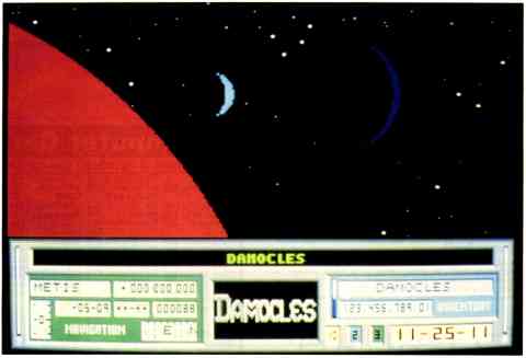 The stunning graphics in Damocles scroll seamlessly, making the Gamma System brim with realism. Doors open for you Star Trek style. Windows overlook the outer landscapes. Street lamps and signs line the highways. The only thing missing from the total Damocles environment is people. (Of course, Eris is supposed to be deserted, but the other planets seem to be as well.) Each planet and city has its own charm. For instance, the moon of Bacchus contains working gambling halls where you can win and lose your money! I was held prisoner in a jail (at least until Mercenary III is published, said the message in the room).