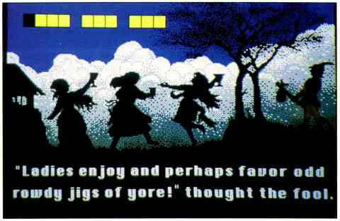 The sentence parser, if it can be called that, has trouble with the simplest input and doesn't even recognize the same verb when it's used with different objects. "Throw stone" works, "throw gloves" doesn't. If you don't type exactly what the program expects, it chokingly responds "Can't. . ." Most of the puzzles are simplistic, the difficult ones resulting not so much from clever situations as from sheer ridiculousness. Why do the doors suddenly unlock? Why is the ship's entrance blocked unless the note's been read? I finished Bride in a few hours, the majority of which was spent wrestling with totally illogical situations or trying to get the parser to understand what I wanted to do. Knowing all the puzzles, this exceptionally short program can be finished in under 10 minutes.
