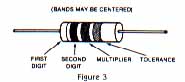 Some of you may not know how to "read" a resistor. Look at Figure 3. It shows a side view of a typical resistor. Notice the bands on its side. These are color-coded according to an industry standard that is used to label every resistor. The first band identifies the first digit of a two-digit value. The second band identifies the second digit. The third band shows how many zeros should be added at the end of the two- digit value. For example, on a 24000 (240K) resistor a red band(2) is followed by a yellow band(4), which is followed by another yellow band (X100000). Because of this standardized coding system, our two resistors can be identified by the following patterns: