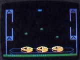 To pick up another mine, maneuver into one of the four mine shacks marked with the ANTIC logo. Proceed carefully. If you hit any walls, the crash will be fatal. When you pick up a mine, your saucer turns blue. When you deposit a mine, you hear a "WHOLP" sound. You can carry only one mine at a time, but there is an unlimited supply in the shacks. The game ends when you lose all of your saucers, or if all three ground bases are wiped out. If you hold out long enough, however, The Cygnians will give up, and you'll win.
