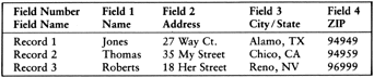 ![]() FIELDS are groups of characters describing a logical piece of data. Records are groups of fields describing a total unit of information, in this case the name and address of a person. A file is a collection of records. In this example, only three records constitute the file. |