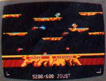In Joust's, Atari, Inc., fantasy scenario, you ride a giant flying ostrich and carry a lance. Your primary task is to unseat wave upon wave of enemy buzzard riders, but you'll also meet several nasty pterodactyls along the way. Joust is unique in several respects. You maneuver by flapping your wings, and you don't shoot your opponents, you bump into them. Joust also features a simutaneous two-player mode in which cooperative and competitive play alternate. This game is so addictive that it ought to be outlawed.