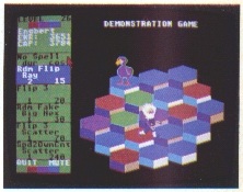With each round you win, the computer offers a spell which you may take and store in a menu column at the left of the screen. There is room for five spells at any time. If you have enough energy points, you may choose any of those spells just beforeyour turn. There are multiple jumpspells, random color flip spells, a "trade places" spell, and some really boggling "confuse" spells wherein several random hexes appear to become colors that they're really not! All this wouldn't be too bad if it wasn't for the fact that your opponents also cast spells. Sir Jake has a bad habit of turning most of the hexes invisible.