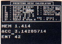This program works like a desk calculator. You type the digits, then enter a single keystroke to perform the calculation. There are also a few control functions, such as turning on the printer. All the instructions you need are displayed onscreen.