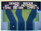 Demon Racer is programmed in the fast, high-powered ACTION! language. This challenging driving game for one player is full of fast-scrolling thrills as you skid and crash through the tortuous course. If you beat the clock, you might get home in time for dinner--but your first objective is simple survival.
