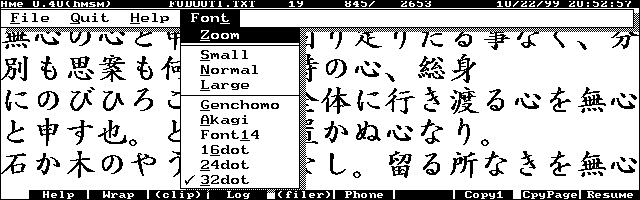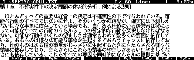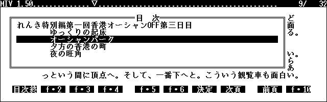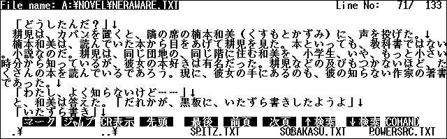 Kei.さんの縦横瞬間切り替え表示可能な超高速テキストビューアLEや、Torryさんの多種多様な画面モードの可変行テキストビューアVVC、みゅうさんの小さなフォントから巨大なフォントまで対応の縦型ビューアJupiter、DOS用の定番A.IdeiさんとY.ShimizuさんのMIEL、小倉 智之さんのsetext閲覧のMIV、ふぃあさんのMFONTにも対応して色々なフォントを随時切り替えながら読書できる浜島さんのMFONTファイルビューアHME.EXMなど、テキスト閲覧ソフトにはこと欠きません。