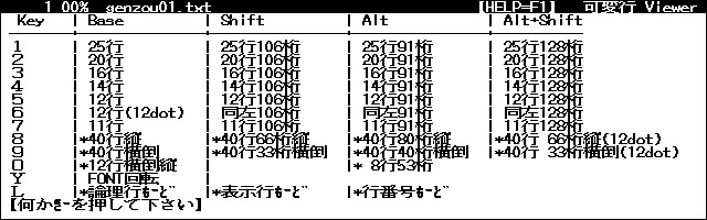 フォントは12ドットのフォントで、16文字×7行固定。選択キーを押すと、一行重なっての一ページスクロール、矢印下キーでは行単位スクロールです。